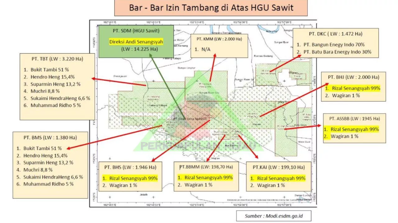 Alih-alih dimanfaatkan untuk perkebunan, HGU sawit ini justru dikavling-kavling menjadi tambang batubara oleh berbagai perusahaan! Bahkan, tambang ini dikuasai oleh keluarga Senangsyah, yang memiliki banyak perusahaan batubara di dalamnya.