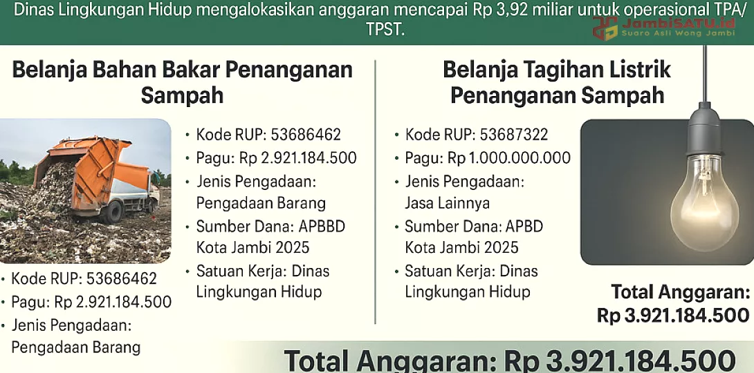 JAMBI – Dinas Lingkungan Hidup (DLH) Kota Jambi mengalokasikan anggaran jumbo hampir Rp 4 miliar untuk mendukung operasional pengelolaan sampah pada tahun anggaran 2025. Fokus belanja diarahkan pada dua komponen vital: bahan bakar kendaraan dan listrik di fasilitas pemrosesan akhir.