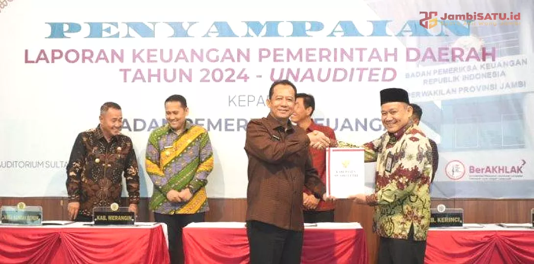 Pemerintah Kabupaten Muaro Jambi secara resmi menyerahkan Laporan Keuangan Pemerintah Daerah (LKPD) unaudited Tahun Anggaran 2024 kepada Badan Pemeriksa Keuangan (BPK) RI Perwakilan Provinsi Jambi, Selasa (15/4/2025), di Auditorium Sultan Thaha, Kota Jambi.