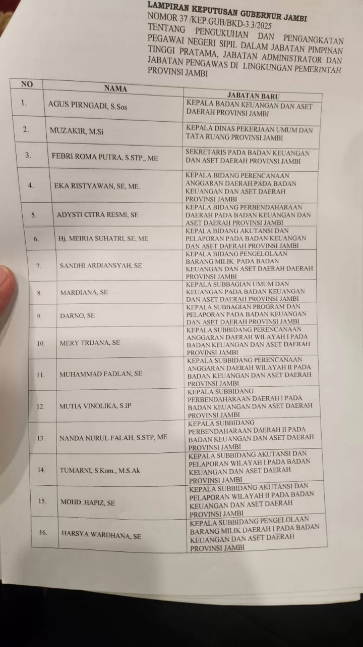 Pelantikan ini diharapkan memperkuat kinerja pemerintahan, mempercepat pelayanan publik, serta meningkatkan efektivitas pengelolaan keuangan, pendapatan daerah, dan pembangunan infrastruktur di Provinsi Jambi. (*)