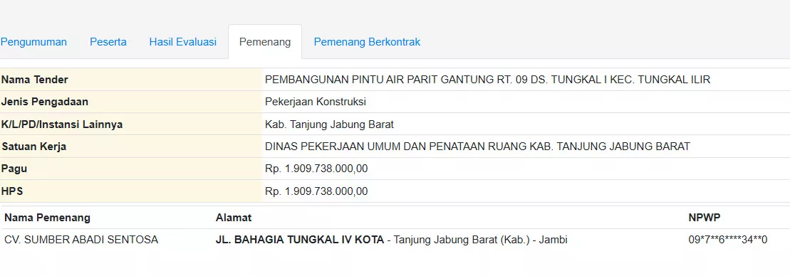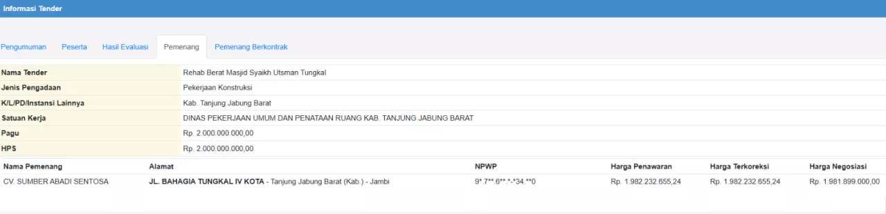 CV Sumber Abadi Sentosa, perusahaan yang beralamat di Jalan Bahagia, Tungkal IV Kota, memenangkan dua proyek strategis. Yakni rehabilitasi Masjid Syaikh Utsman senilai Rp 2 miliar dan pembangunan Pintu Air Parit Gantung senilai Rp 1,9 miliar.