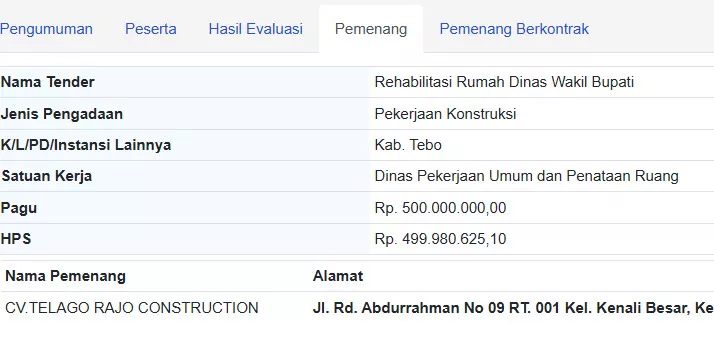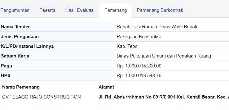 Pada tahun 2024, proyek rehab rumah dinas Wabup Tebo dimenangkan CV Telago Rajo Construction dengan nilai negosiasi Rp 498,8 juta. Nilai HPS Rp 499,9 juta. Namun, dalam audit LHP BPK RI, proyek ini ditemukan kelebihan pembayaran, karena volume pekerjaan seperti keramik, atap, dan pengecatan tidak terpenuhi sepenuhnya.