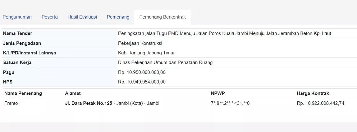 Untu proyek Tugu PMD, tender proyek ini dimenangkan Frento lewat APBD Perubahan 2024 yang dikelola Dinas PUPR Tanjabtim. Dari 12 peserta, Frento mengajukan penawaran Rp 10.922.008.442,74 atau 99,74% dari pagu Rp 10,95 miliar.