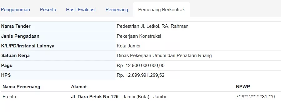 BPK RI juga menemukan masalah pada proyek Pedestrian Jl. Letkol RA Rahman (Rp 12,87 Miliar). Tender ini dilaksanakan Dinas PUPR Kota Jambi melalui APBD 2024 dan diikuti 14 peserta. Frento menang dengan penawaran Rp 12.874.100.200 atau 99,8% dari pagu Rp 12,9 miliar.