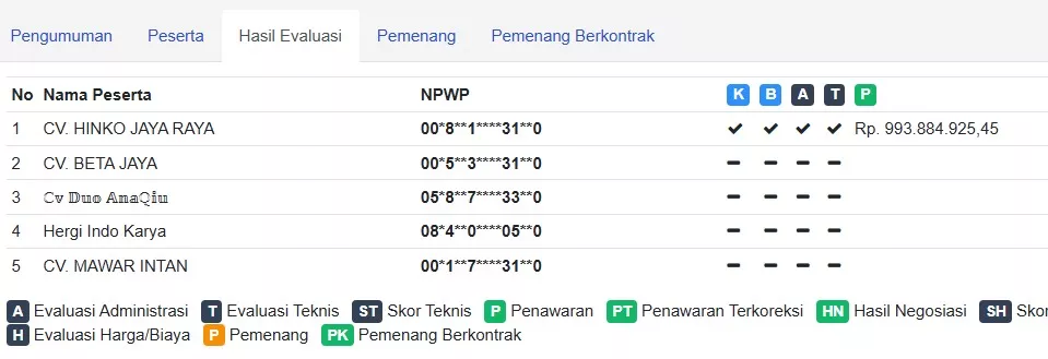 Namun, hanya CV Hinko Jaya Raya yang memasukkan penawaran resmi sebesar Rp993.884.925,45, yang kemudian ditetapkan sama sebagai harga terkoreksi maupun harga negosiasi. Dengan kondisi ini, Hinko menang mudah tanpa kompetisi berarti.